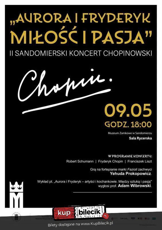 II Sandomierski Koncert Chopinowski pt. "Aurora i Fryderyk - miłość i pasja" poświęcony jest jednemu z najważniejszych i najbardziej poruszających wątków w życiu Fryderyka Chopina - relacji łączącej kompozytora z George Sand. Dobór repertuaru podporządkowany jest idei ukazania muzyki Chopina jako zapisu emocji, pasji i duchowej relacji dwojga wybitnych indywidualności. Wykonawcą koncertu będzie Yehuda Prokopowicz - pianista młodego pokolenia, laureat konkursów pianistycznych, regularnie koncertujący w kraju i za granicą, który w XIX Międzynarodowym Konkursie Pianistycznym im. Fryderyka Chopina w 2025 roku zdobył prestiżową nagrodę specjalną Polskiego Radia za najlepsze wykonanie mazurków. Bilety do nabycia na: KupBilecik.pl