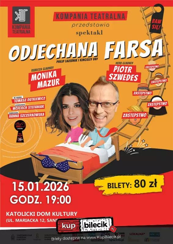 bilety: "Odjechana farsa" - najbardziej odjechane i nieprzewidywalne dwie godziny twojego życia!!! Obejrzenie "Odjechanej farsy" może być przyczyną niemożności powstrzymania śmiechu i grozi intensyfikacją dobrego humoru. Przed wizytą w teatrze skonsultuj się z lekarzem lub farmaceutą. A potem, niezależnie co powiedzą… i tak przyjdź na "Odjechaną farsę". Najwyżej umrzesz ze śmiechu… Czy w jednym niewielkim pokoju hotelowym zmieści się 10 osób, z których każda będzie miała swoje plany związane z tym pokojem i osobami w nim się pojawiającymi? Tak…ale pod warunkiem, że w owych 10 osób wcieli się dwoje wyśmienitych aktorów, którzy brawurowo zagrają dziesięć różnych postaci w dziesiątkach zaskakujących i absurdalnych sytuacji. Sławny pisarz piszący poradniki małżeńskie - jak żyć w szczęśliwym związku - ze swą nieszczęśliwą i znudzoną związkiem żoną, senator incognito wraz z kochanką pragnącą za wszelką cenę sławy, siostra zakonna ze inklinacjami do show biznesu, nachalny i wścibski boy hotelowy, przebiegła reporterka miejscowej stacji telewizyjnej - to tylko kilkoro postaci z tej niezwykłej galerii ludzkich osobliwości, które los połączy przez kilkadziesiąt minut w małym pokoju hotelowym na dalekiej prowincji. Świat w pigułce i pigułka eksplodująca emocjami, żądzami i uczuciami, które… mieszkają w każdym z nas. "Odjechana farsa" to zupełnie zwariowana i nieprzewidywalna teatralna przygoda, to zabawa w najczystszej formie, to popis aktorskich umiejętności najwyższej klasy i Mount Everest komediowej formy. Błyskotliwe i przezabawne dialogi, nieprawdopodobna historia i zawrotne tempo akcji, imponująca inscenizacja oraz gwiazdorska obsada. Wszystko czego potrzeba, ażeby spędzić najbardziej odjechany i relaksujący wieczór w małym, ale niezwykłym pokoju hotelowym. Odjechana farsa artyści: Joanna Koroniewska, Piotr SzwedesOdjechana farsa” – najbardziej odjechane i nieprzewidywalne dwie godziny twojego życia. Obejrzenie „Odjechanej farsy” może być przyczyną niemożności powstrzymania śmiechu i grozi intensyfikacją dobrego humoru. Przed wizytą w teatrze skonsultuj się z lekarzem lub farmaceutą. A potem, niezależnie co powiedzą… i tak przyjdź na „Odjechaną farsę”. Najwyżej umrzesz ze śmiechu… Bilety do nabycia na: KupBilecik.pl |